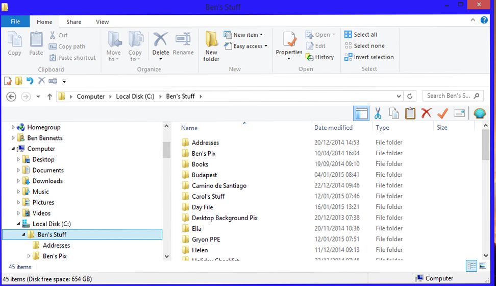 And for the record, I do not use Microsoft’s standard top-level folders. I have created my own Ben’s Stuff folder/sub-folder filing system and it suits me fine. This doesn’t mean I can always find the file I’m looking for straight away but, hey, there’s always the Search facility! That works.