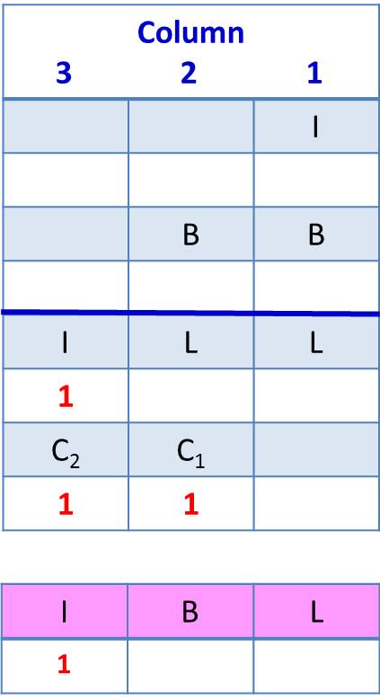 From Col. 1: I + B = C1L (Eqn. 1) where C1 is the carry-over, if any, into Col. 2 from the I + B addition.