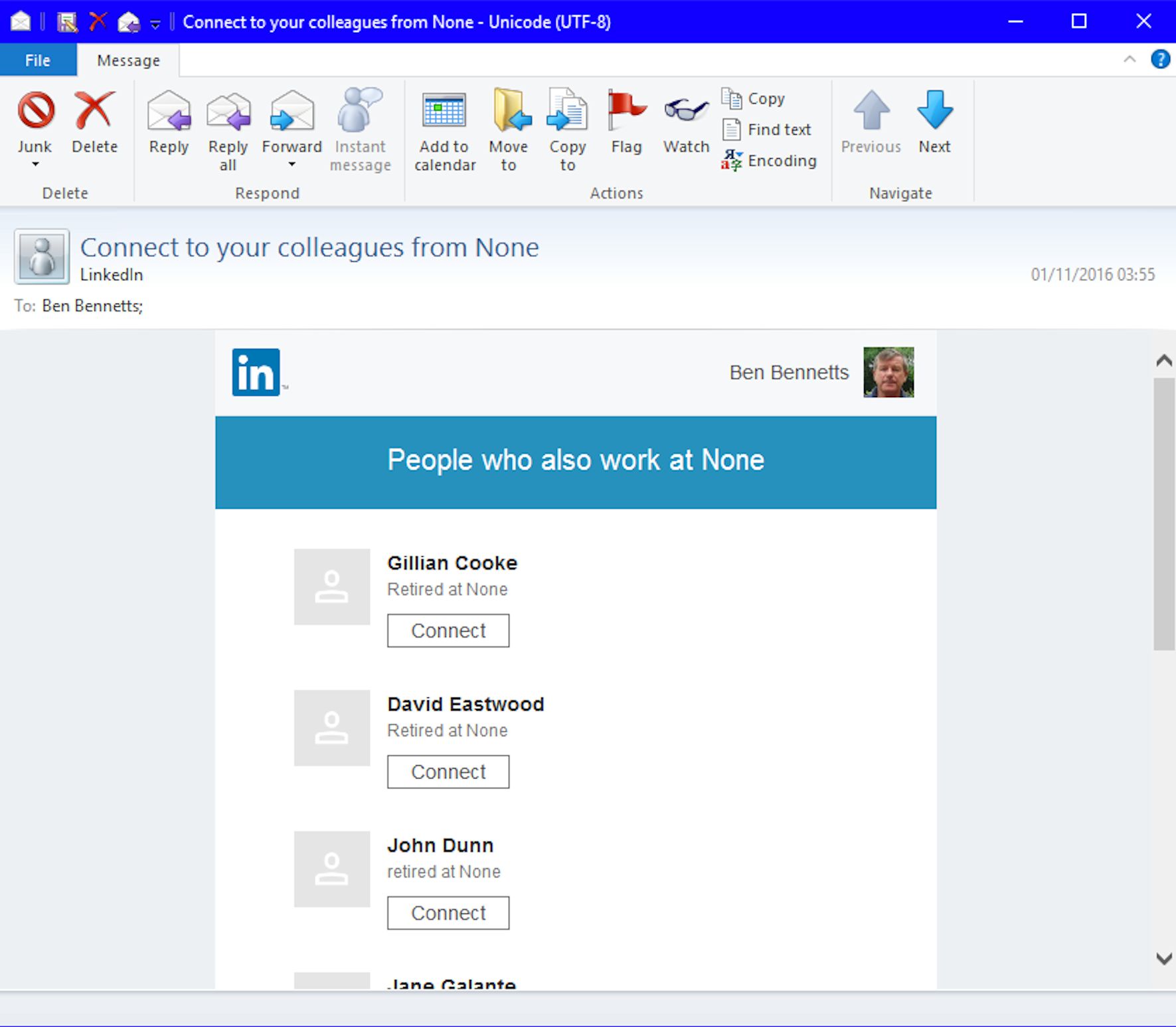 It seems I am not alone. This morning I received an e-mail from LinkedIn inviting me to connect with other “Retired at None” colleagues:
