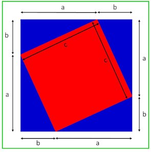 Note: the red square lies on top of the blue square and we see four blue identical right-angled triangles. Let a and b be the length of the triangle sides that embrace the right angle. The hypotenuse of each triangle is of length c.
