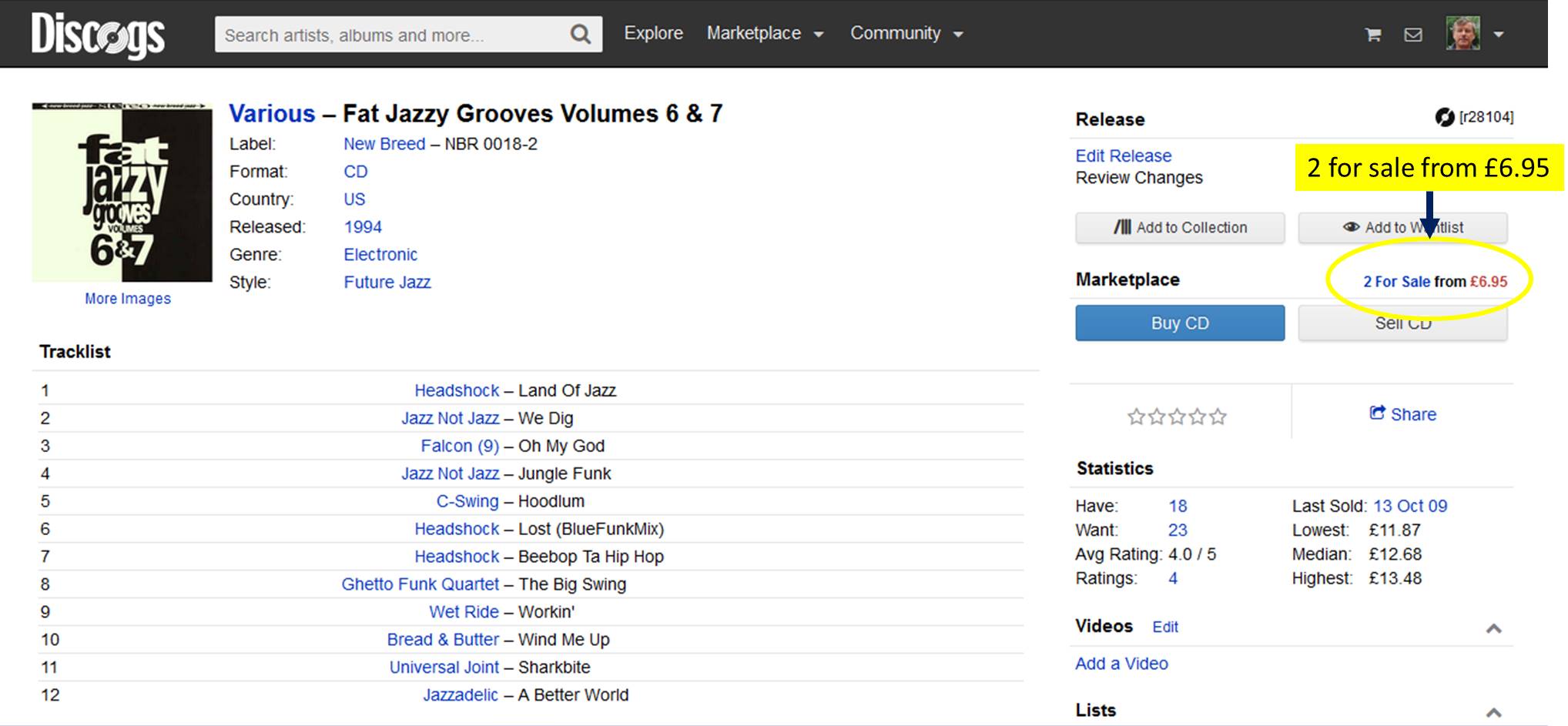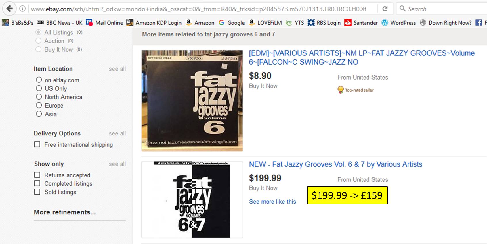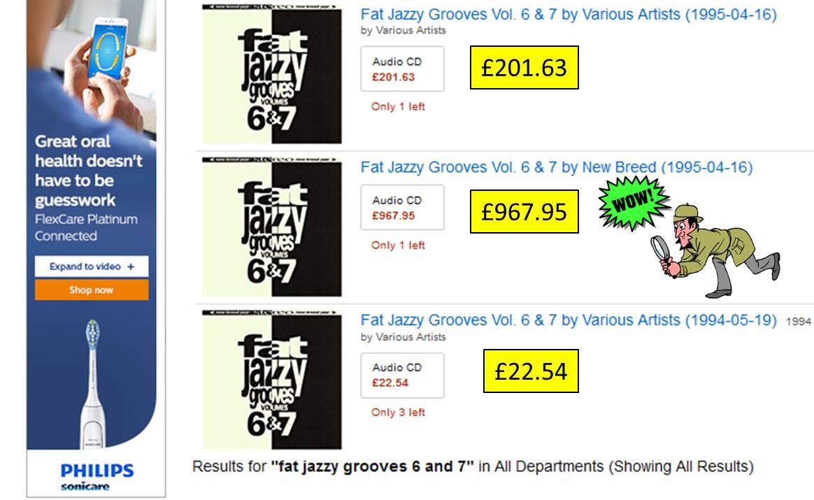 I have a theory about this however. I reckon that websites that sell single CDs (they normally state that they have just one CD left) are biding their time until all the lower-cost items have been sold and then they wait for the person who desperately wants the item at any cost. I didn’t extend my search for Fat Jazzy Grooves, Vol. 6 & 7 beyond the three websites above but even across those three sites there were only nine copies of the CD available so maybe it won’t be that long before eight are snapped up leaving the £967.95 priced copy the only game in town. At that point, if it sells at that price, the seller has made a killing.