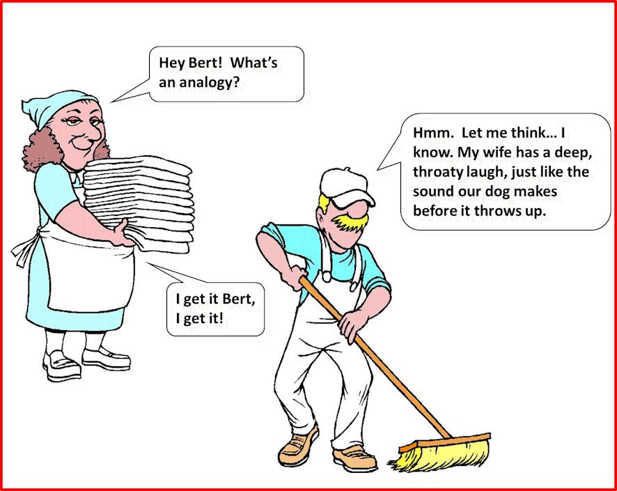 This again is teaching (or explaining) by analogy but in this case I did not substitute one word for another hence it is not analogy by direct substitution. I call this variation analogy by enhancement and, just like the direct substitution technique, you need to get the original generic description just right so that you can bring out the similarities or parallels between the two subjects.