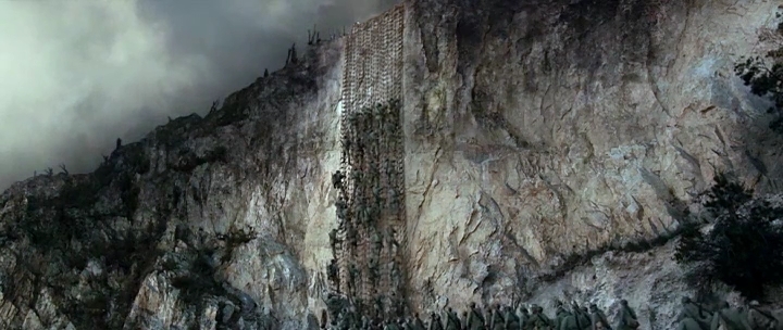 At this point, Japanese soldiers appear at the top of the ridge and start shooting at the Americans below. The Americans fire back and the Japanese soldiers retreat from the edge. This scene begs the question—if the Americans had been repulsed three times already and if on each occasion the Japanese could approach to the very edge of the ridge, why didn’t they cut the ropes that secured the top end of the rope-ladder net thus preventing any further ascents?