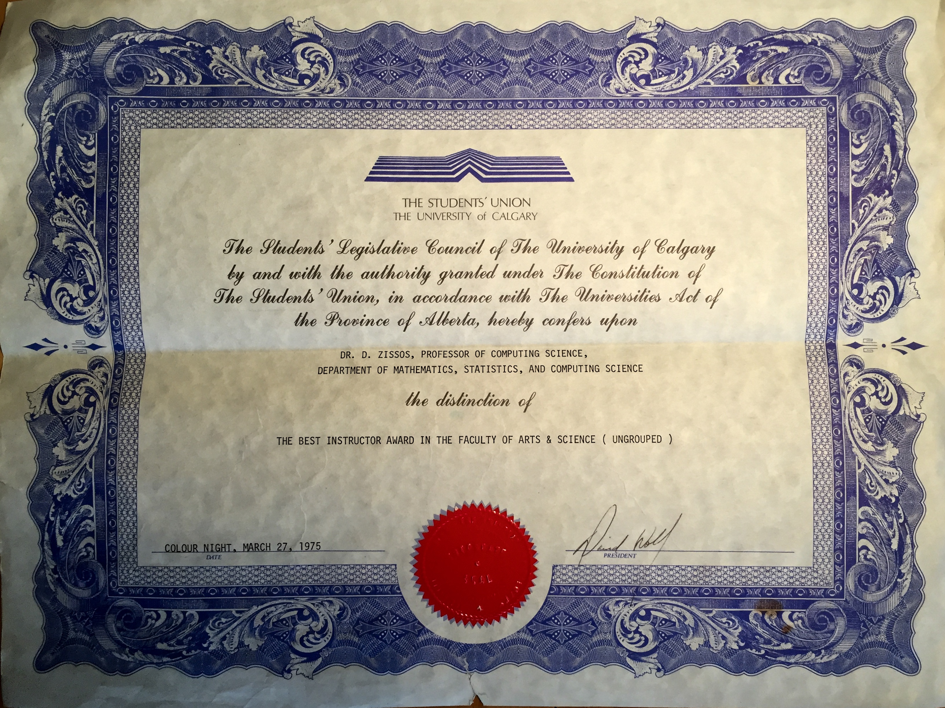 Demetrius Zissos, Best Instructor Award, 1975, Students’ Union, University of Calgary.