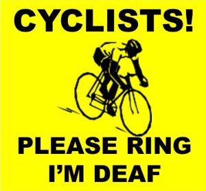 Last week, I walked the same route and was blindsided by a male cyclist. The canal path was muddy, there were tree stumps protruding in the pathway, the recent rain had created puddles, and I was walking carefully, eyes down, mindful of what could happen if I slipped. The cyclist appeared silently from behind without warning at my right shoulder, and rode on by without a word. I could have stepped unknowingly into his path, or reacted badly in some other way to his sudden presence. This has happened to me before and I’ve often thought of making a “Cyclists! Please Ring; I’m Deaf” placard to wear on my back, but the real solution is for cyclists to either ring a warning bell or at least shout before passing from behind. But, such incidents bring home one of the perils of being hard of hearing.
