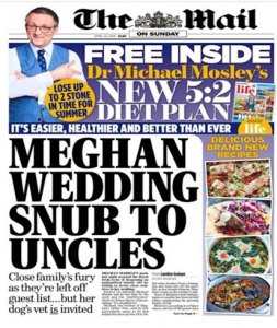 The Daily Mail’s front page headlines the fury of the Markle family at not being invited to the Royal Wedding next month. (I commented on this recently.) In the BBC’s reviewer’s summary, I read: