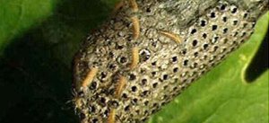 It turns out that this particular moth lays its eggs, up to 300 of them, in rows along a branch and these rows are called egg plaques. Here’s a picture: