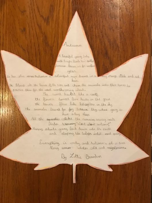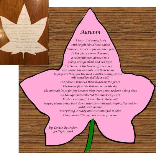 My youngest granddaughter, Lottie, aged 10, has started writing what to me are amazingly creative literary works, full of imagination, evocative images and adjectival colour. Recently (September 2018), she was asked to write a poem about nature using personification of non-human life forms or abstract notions – a tough brief for a 10-year-old. Here is her un-aided result. It was her idea to encapsulate the poem in the outline of an ivy leaf.