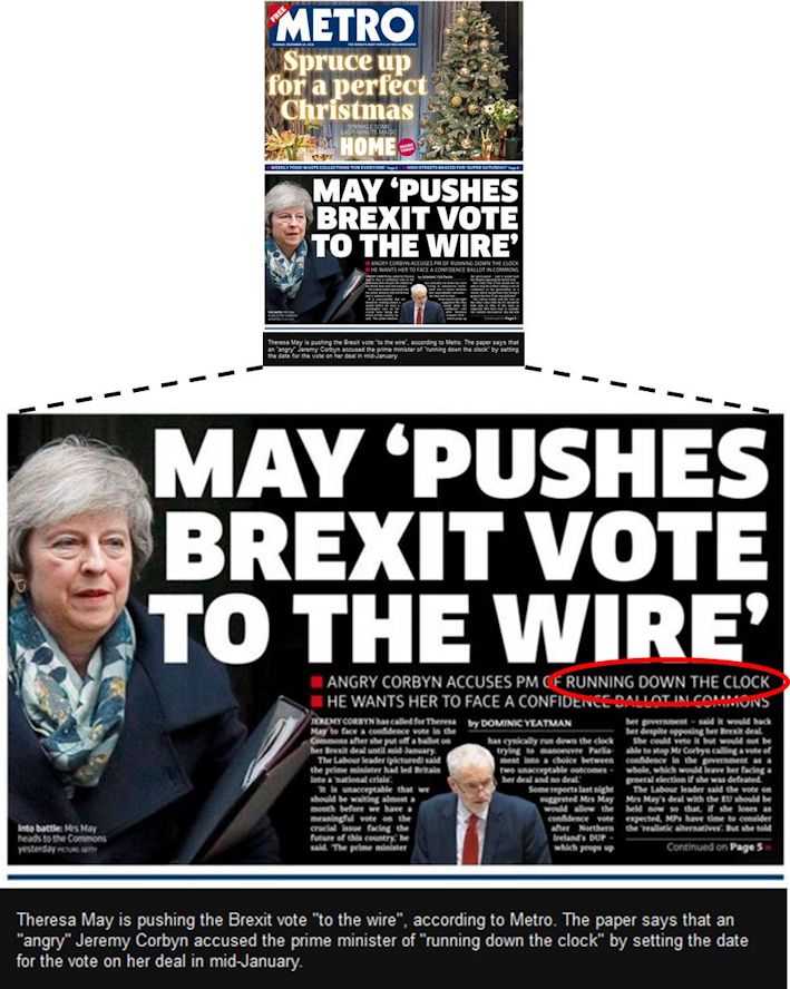 In Corbyn’s use of the expression, he is accusing Theresa May of delaying the vote until there is no time left between the mid-January vote and the March 29 Brexit deadline to discuss what happens next if May loses the vote. In other words, those MPs tempted to vote against the Brexit deal may rethink their position and vote for the deal rather than face the chaos a no-deal exit will engender.