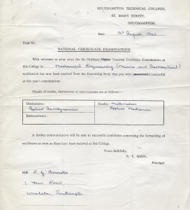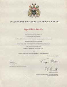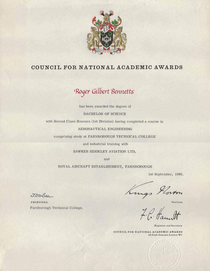 At the time, there was much discussion about the implications of the Robbins Report. In my own case, I argued that the Dip Tech was not the same as a traditional university BSc in engineering. The Dip Tech course I followed was a 4-year course with, every year, six months in college and six months spent in industry – in my case, sometimes back at Folland Aircraft, Hamble, but mostly in the Royal Aircraft Establishment, RAE, in Farnborough now, alas, no more. Half my four years obtaining the degree was working in industry refining my practical skills. That doesn’t happen with a full time 3-year BSc degree course at, say, Bristol University, and I was unsure of what the new BSc paper award meant in terms of my ability to compete with those who had graduated with what I then considered to be a bona fide degree in aeronautical engineering.