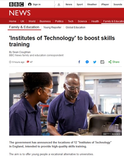 Be that as it may. My purpose in writing this blog is not to criticise the current UK university scene, although I may do this in a future blog. No, it’s to comment on today’s announcement of the location of twelve new Institutes of Technology designed to “boost (engineering) skills training”. We’ve come full circle!