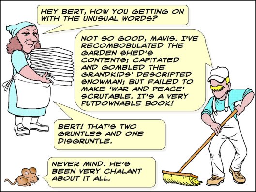 Now I’m away to compose a short piece of prose that uses each of the following twelve words, or derivatives thereto: abiology, buccalise, capitate, chalant, combobulate, cumber, descript, gomble, gruntle, putdownable, ruly, and scrutable. You can try as well. If you do, here’s a summary of the words and their meanings.