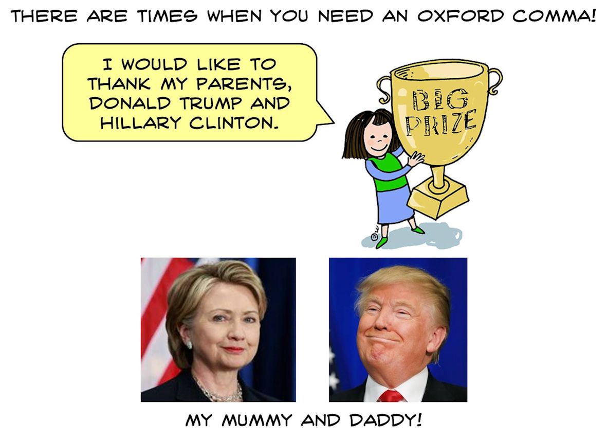 Oxford commas rule, okay? See the illuminating example above. I suspect that the Big Prize winner meant to say, “I would like to thank my parents, Donald Trump, and Hillary Clinton.” All three parties would be happy with that.