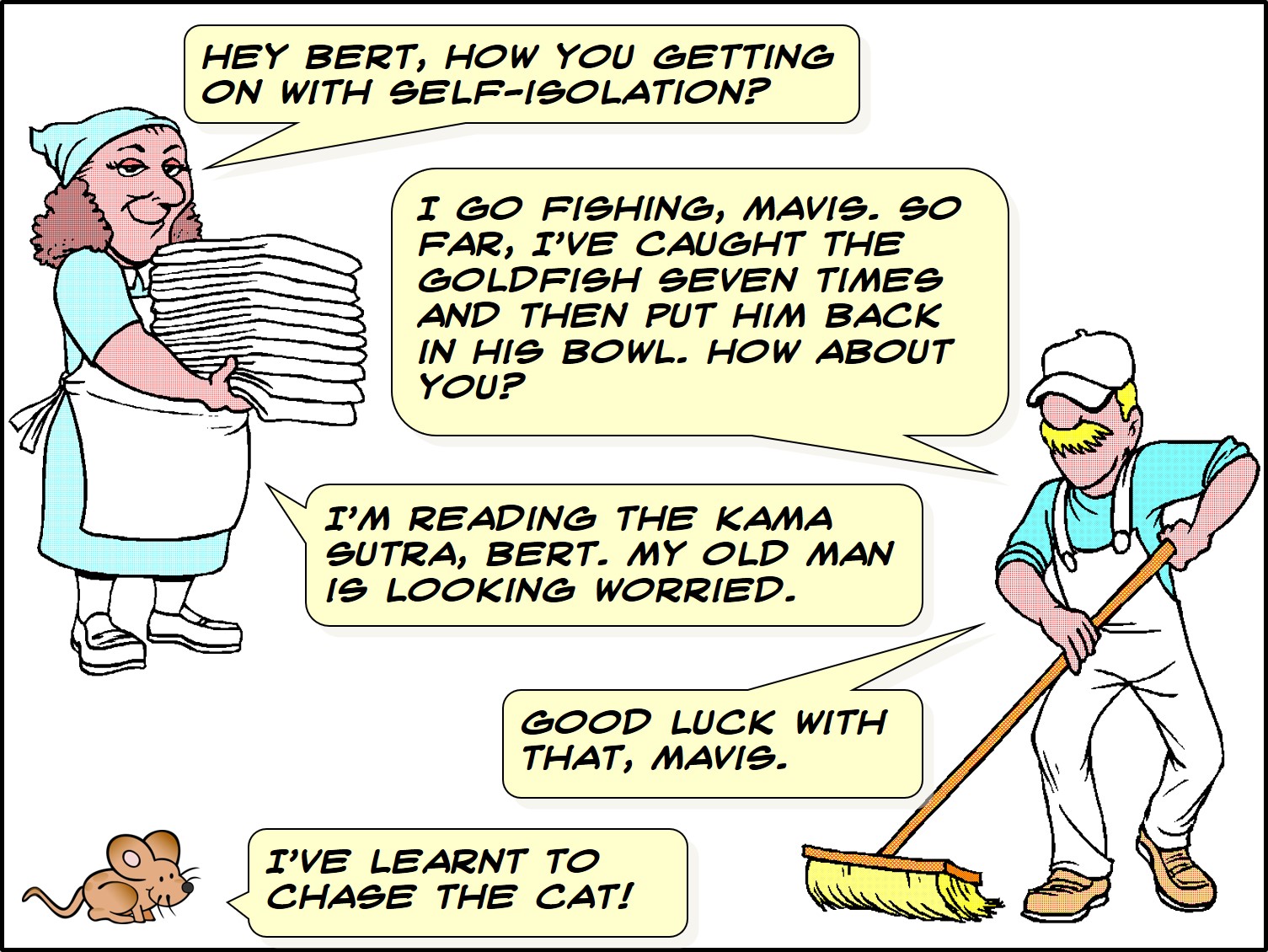Some of these ideas have come from my 2019 booklet, Staying Fit in your Golden Years, targeted at elderly people. If you have small children to amuse, you won’t get cabin fever. You will contract exhaustion!