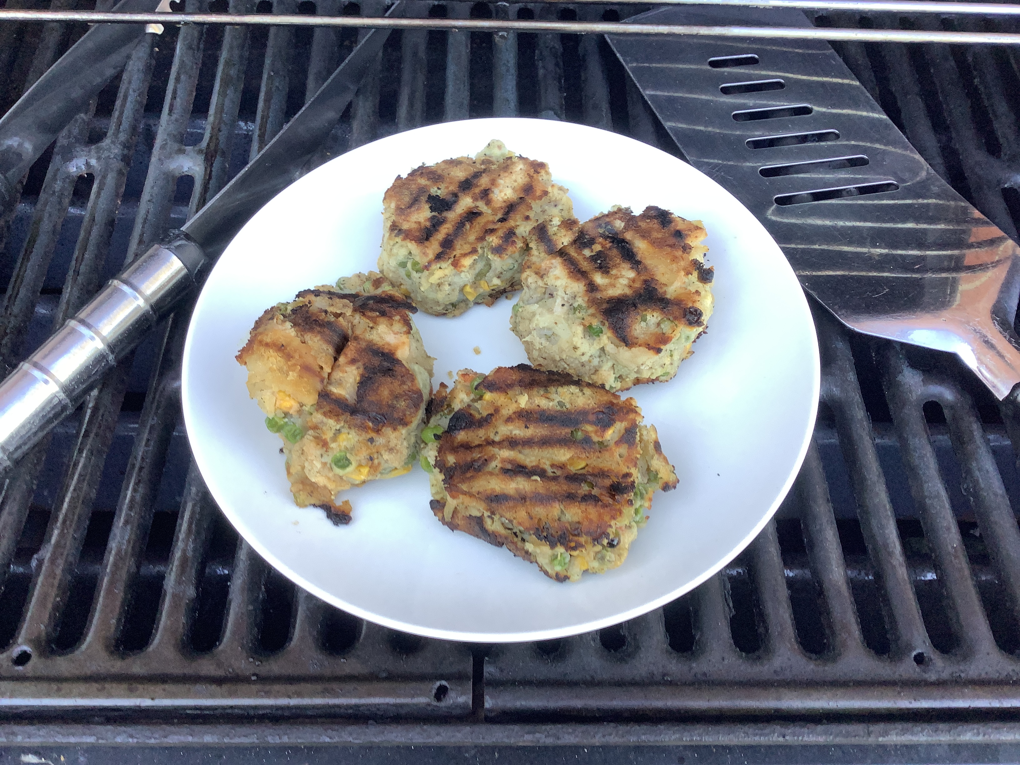Yesterday evening, I cooked some sausages and beef burgers on the barbecue and thought about what I might do with our current accumulation of leftover veg. I could make a veggie burger for the barbecue, I thought, and turned to Google to see what others might have said about converting leftover veg into a veggie burger suitable for cooking on a barbecue rather than in a frying pan. I entered Bubble and squeak burger for the barbecue into the search engine. Lots of recipes came up but none specifically targeted at the barbecue. Hmm. Guess I’ll have to invent my own, I thought, and that’s what I did. Here is my recipe.