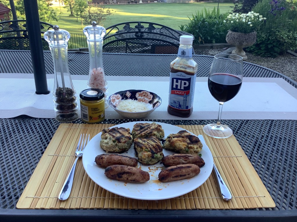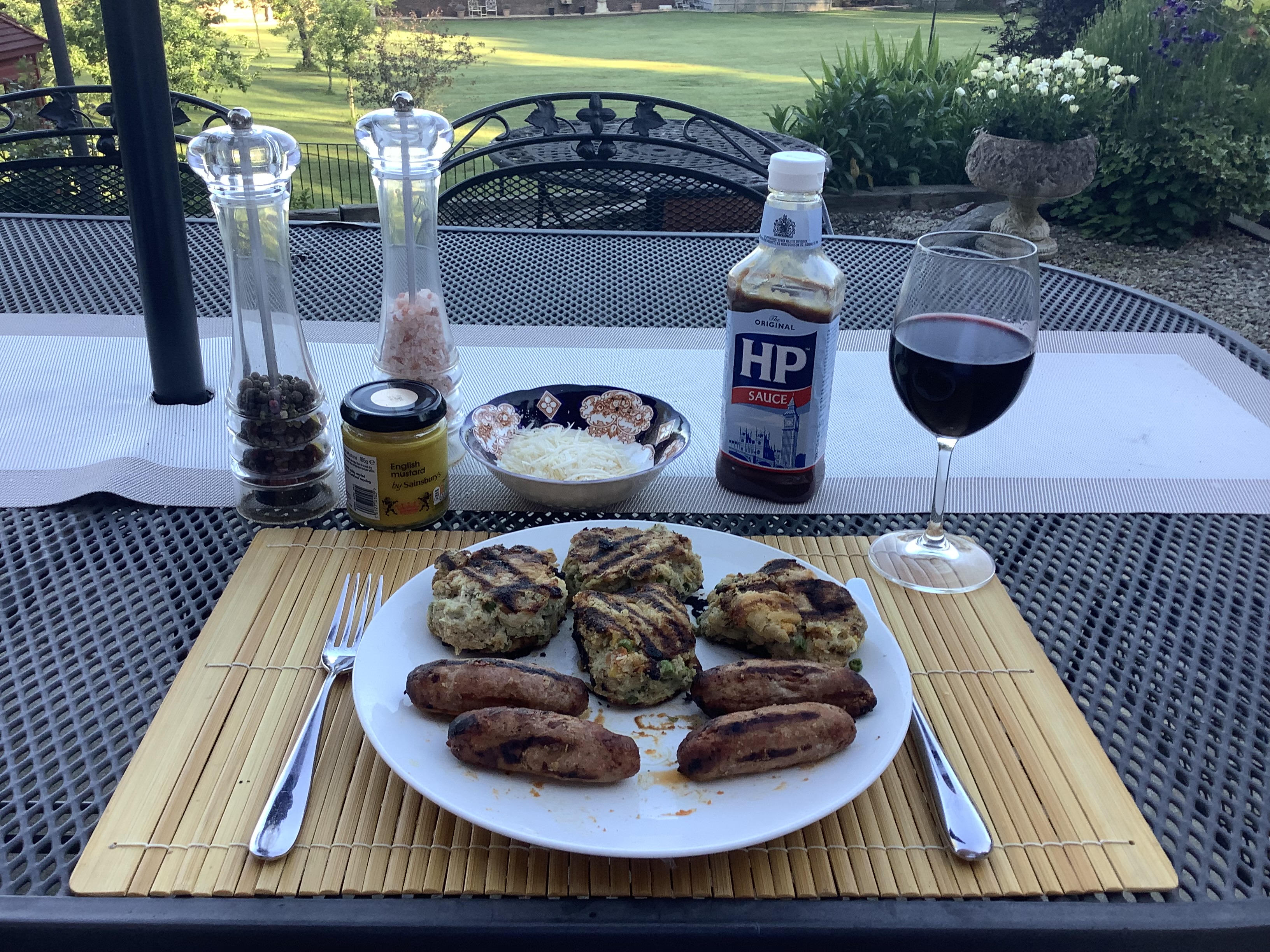 Serve with whatever meat (or fish) you’ve grilled plus your favourite condiments (e.g., HP sauce, English mustard, pepper and salt), grated parmesan cheese if you like this cheese, and a glass of a robust red wine.
