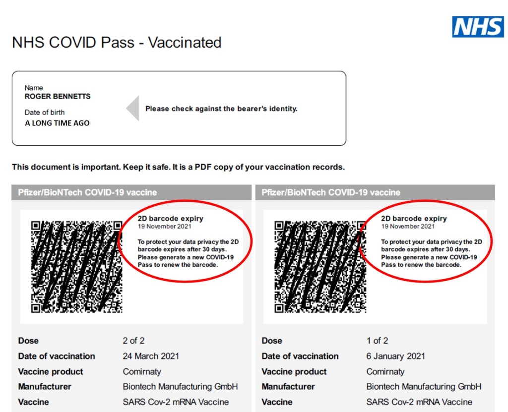 Part of my NHS COVID-19 Pass. Barcodes rendered unreadable to protect my data privacy!