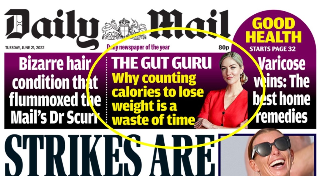 Let us also return to Megan Rossi’s point – counting calories is a waste of time. Is she right? Maybe just a little bit but the headline does not tell the whole story. It has long been held that in order to lose weight we must control our calorie intake as related to our daily need for calories to supply fuel to keep us alive. “If you consume more calories than the body requires, unused calories will be deposited and stored as fat. If you consume fewer calories than the body requires, the body will draw on the store of unused calories, if available, and you will lose weight.” So reads the mantra. And it’s true. An excess of unused calories results in deposits of calorie storage around the body – fat. But, here’s the first problem. How many calories do we need each day to maintain a weight equilibrium? There are as many answers here as there are spots on a leopard! Are you male or female, or in-between? What age are you? Do you exercise regularly? What type of exercise – cardio, muscle, aerobic – and at what level? What is your Basal Metabolic Rate (the rate at which you burn calories to fuel basic bodily functions when either lying in bed or otherwise in a resting state)? How efficiently does your metabolic system convert calories into energy that is used by the muscles, heart, brain, lungs, liver, and all the other parts of the body that require energy to function? What is the ambient temperature in which you exist – are you warm, cold, or comfortable – and how does this ambient temperature change throughout a 24-hour period? Do you eat regularly, with or without snacks in-between? And so on. If we look up how many calories we need per day to neither gain nor lose weight (called the maintenance calorie level), how much credence can we place on a single figure? For example, in my case – male, aged 80 – the NHS website advises 2,500 calories/day based just on my sex whereas the VeryWellFit website takes into account my sex, height, weight, and age and, via a magic formula, comes up with 1,632 calories/day. That’s one helluva difference!