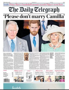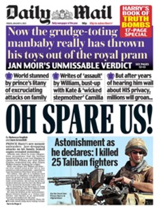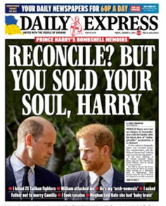 The oldest and most respected UK ‘posh people’s’ newspaper, The Times, leads with a headline that uses devastating as an eye-catching adjective to describe the memoir accompanied by a sober photograph of the brothers back-to-back to indicate the scale of animosity between them. Two of the three subheads – William called an arch-nemesis by Harry and William’s alleged physical altercation with Harry – reinforce the animosity; the third, revealing Harry’s claim that he killed 25 Taliban fighters in Afghanistan, also merited a subhead mention. I find the death-count claim an odd choice of subhead given that The Times is a champion of the British monarchical establishment and there are alternative revelations that would have further revealed the implied damage to the present Royal family.