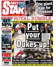 The Daily Star has had a long battle with the Harry and Meghan Road Show, dubbing them the world’s shyest couple who do everything they can to avoid publicity and media persecution, and blocking out their eyes in photographs to preserve their anonymity, a pictorial redaction. Using terms such as ‘Royal Rumble’ and ‘Put your Dukes up’ (nice double entendre), the paper concentrates on the rift between the brothers. The text also alludes to the revelation that he ‘had nookie in a field with an older woman who smacked his arse’, referring to the woman as a ‘cougar’ (defined to be a sexually mature middle-aged woman who seeks out a younger man for companionship and, usually, a sexual relationship – think Demi Moore, Joan Collins and Madonna). I have no doubt whatsoever that within the next six months we will see the publication of at least three books from three different women each of whom will claim to be that woman and describing in great detail what went on that field – Foreplay and Frolics in the Field, Fieldcraft with Harry, or Educating Harry in the Rough. Mark my words.