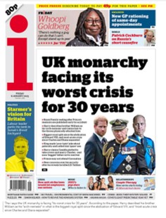 The left-wing-ish Guardian, which often relegates stories about the Royal family to the inside pages, moves the story to the lower half of the front page and, like The Times, headlines the animosity between Harry and William, this time choosing a photograph of the brothers shooting eye daggers at each other. The Guardian is not a supporter of the British monarchy and probably relished the opportunity to highlight the ‘crisis for royal family’ on their front page.