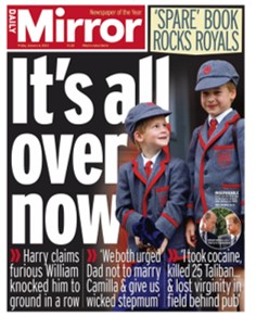 The left-wing Mirror invites us to compare and contrast a photo of a pre-teen schoolboy Harry adorably looking up at older-brother William sidelined with a cropped insert photo showing the now-familiar adult brothers scowling at each other and with the headline ‘It’s all over now.’ There’s no mistaking the no-way-back intention of the pictorial spread.