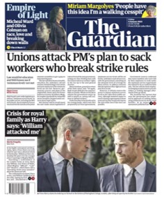 Today, four days ahead of the official publication of Harry’s autobiographical book, Spare, the UK newspaper editors have succeeded in obtaining a copy of the book accidentally released to a Spanish book chain, Casa del Libro. And, boy oh boy, do we have a feast of revelations! What’s of interest to me is how each national newspaper chooses to headline and sub-headline their individual takeaways on the contents of Spare. Let’s start with the so-called heavies and then work our way through the popular tabloids down to the irreverent and sometimes jokey sensationalistic tabloids.