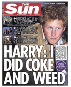 Harry did coke and weed shouts the headline in The Sun. My goodness, what are we to make of that? Should he be stripped of all his titles – unprinced and deduked – and banished to a remote island in the Pacific? And what about the further revelations in the subheads – sex at 17 in a field behind a pub (could have been worse; sex behind the bike shed at Eton?) – and an alleged negative response from ‘the Army’ about his 25-dead-Taliban boast, later revealed to be ex-army officer colonel, Richard Kemp. The photo shows a slightly-worse-for-wear photo of a youthful ‘Party Prince’ Harry which, judging by the slight smirk on his face, was taken just after the sex in the field incident. More on this event later.