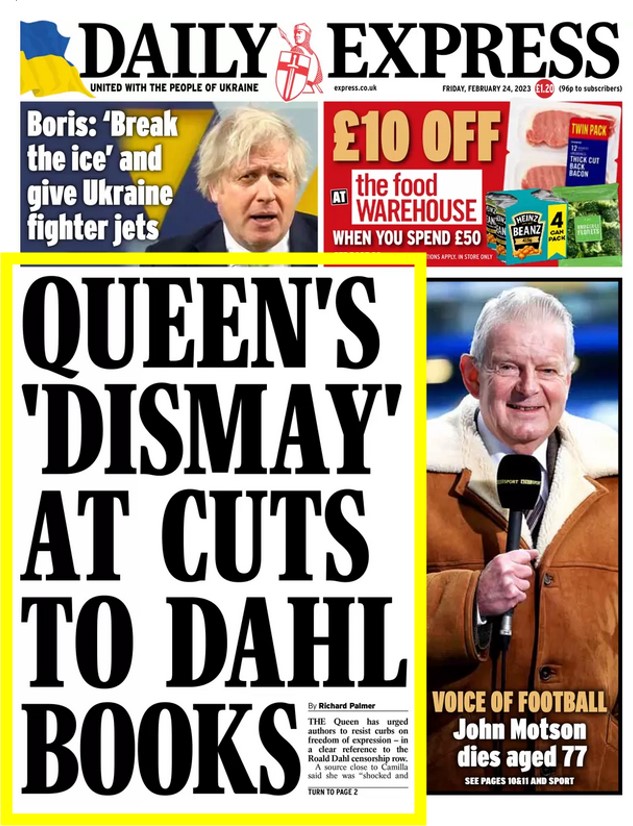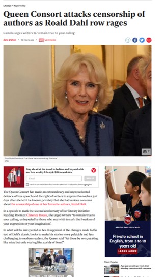 I have noticed recently that The Times has taken to dropping the word consort when referring to Camilla by her title. She is simply referred to as Queen. But confusion reigns in other UK newspapers. Yesterday, Camilla weighed in against the editors at Puffin Books for sanitising Roald Dahl’s books for children. Here’s how today’s front pages refer to her intervention both in headline and in the first in-text reference.