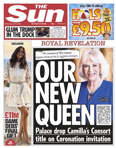 It’s official. The BBC and two of today’s national papers, The Sun and Daily Mail, are headlining the fact that the official invitation to Charles’s coronation refer to Camilla as ‘Queen Camilla’. The BBC is also reporting this momentuous declaration.