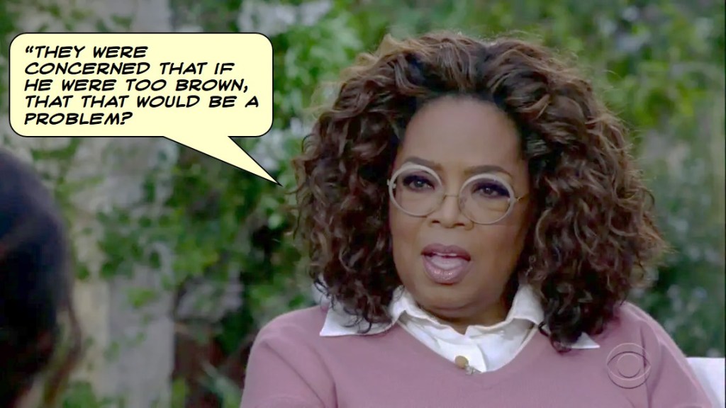 Oprah Winfrey’s reaction when Meghan revealed that there were ‘concerns and conversations about how dark his skin might be.’ March 7, 2021 interview