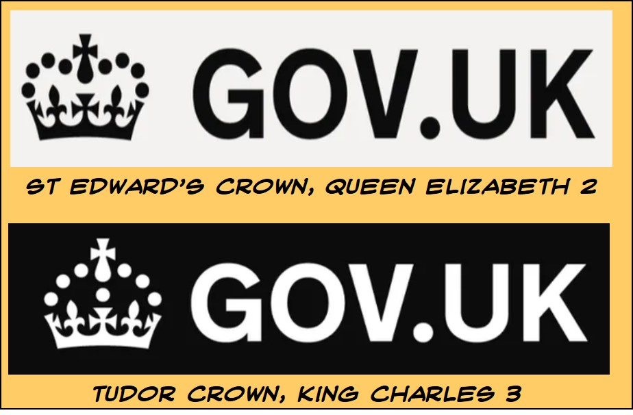 Why am I telling you about this crown and its iconic use on the gov.uk website? Because it’s a replacement for the St Edward’s Crown icon that used to be there during Queen Elizabeth’s reign over the citizens of the UK and other places. Queen Elizabeth 2 favoured the crown of Saint Edward, but her successor, King Charles 3, is more inclined to the Tudor crown. Here are the two icons: