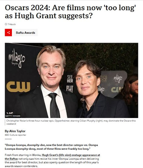 I had thought of writing a blog about this, but Hugh Grant’s comment and BBC Culture Reporter Alex Taylor’s article beat me to it. These days,I routinely watch movies with runtimes in excess of 2 hours, not just from Hollywood (Oppenheimer, Killers of the Flower Moon, The Holdovers, and the French movie Anatomie D’Une Chute (Anatomy of a Fall)) but also from South Korea, Australia, Europe, and elsewhere. On my current watch list there are eleven movies stacked up. Five of them – The Pianist (2002, Europe), The Promised Land (2023, Europe), Remember (2022, S. Korea), About Dry Grasses (2023, Turkey), and Radical (2023, Mexico) – are over 2 hours long. Yesterday’s excellent Korean movie, Next Sohee (2022), was 2 hours 17 minutes. Two other movies I’ve watched recently – Poor Things and Saltburn – are over 2 hours.